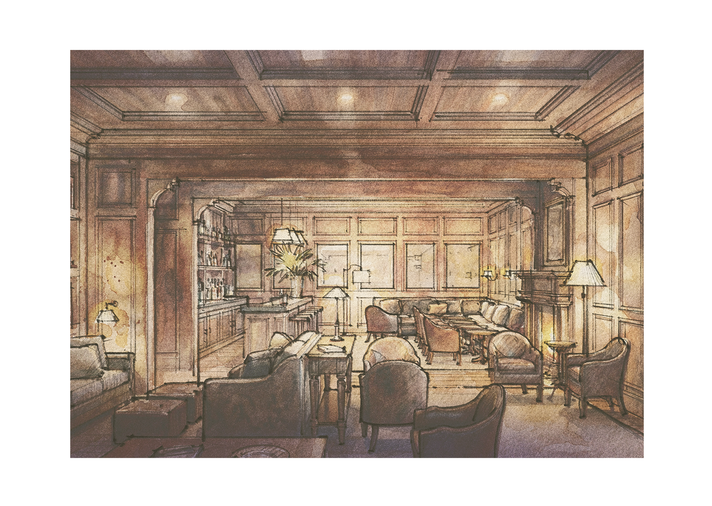 The Library and Billiards Room is Westerfield at its most private—a richly appointed retreat designed for quiet evenings and unhurried company. Wood-paneled and softly lit, it recalls the great club rooms of another era, where time moved more slowly and tradition carried weight. A working fireplace anchors the room, surrounded by deep, comfortable seating suited for conversation, reflection, or a well-made drink at day’s end. Beyond, the billiards room offers a discreet escape—intimate, familiar, and intentionally removed from the day’s pace.