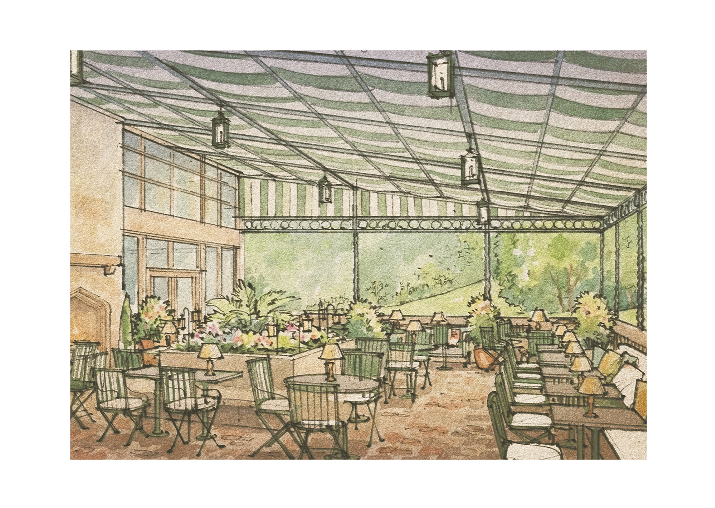 Beyond, a covered outdoor terrace extends the experience into the landscape, offering an easy transition from indoors to out. Thoughtful seating arrangements and decor create a space where the beauty of the natural environment at Westerfield is even further enhanced through intentional design.