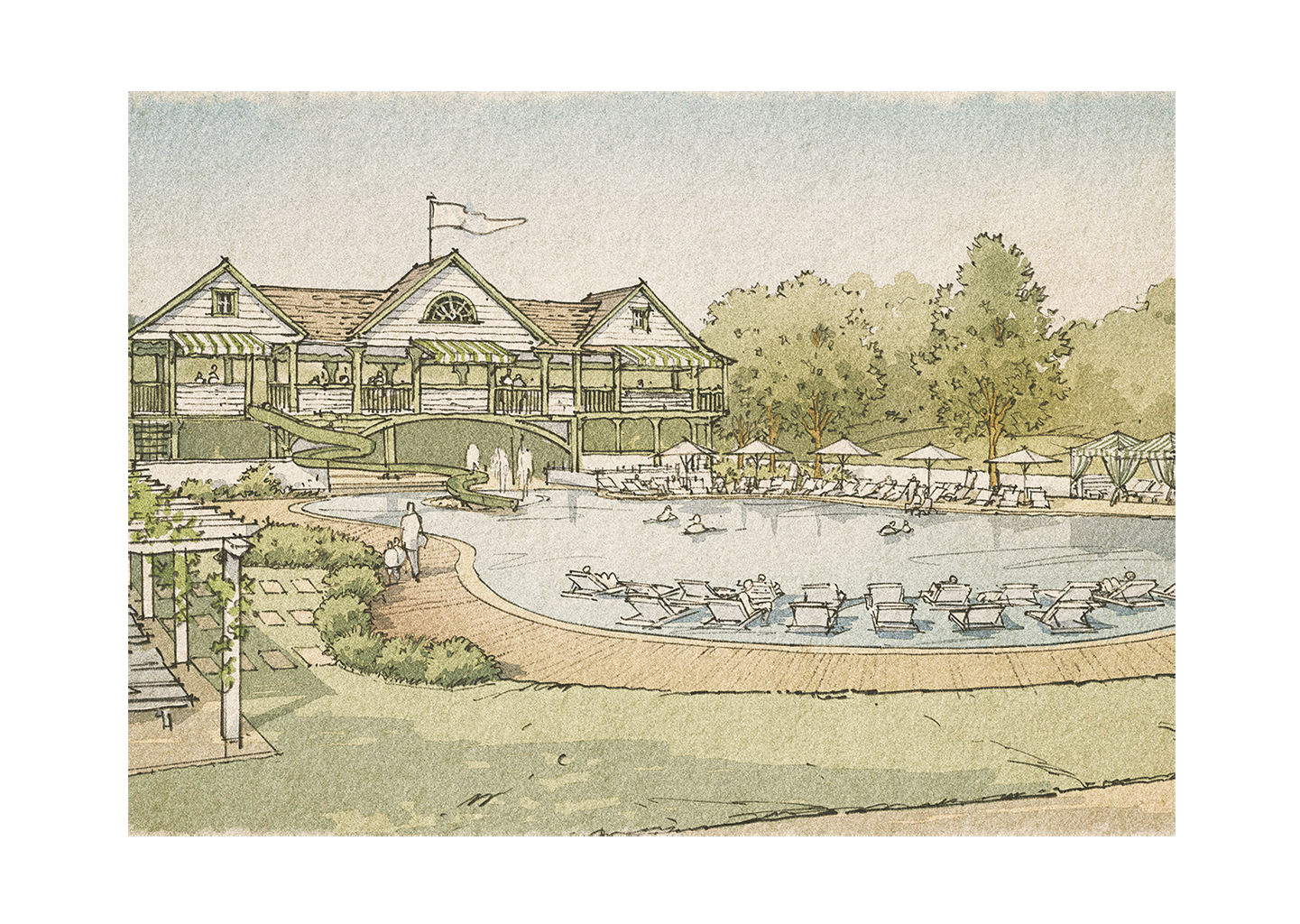 At the heart of Westerfield, a resort-style pool serves as both retreat and social hub. Spanning more than 11,500 square feet, it is anchored by six private cabanas just steps from the water. The experience is thoughtfully layered, with submerged loungers at the water’s edge, a 85-foot water slide, and a splash pad for younger guests. The Family Pavilion offers a new, outdoor pool bar and family-friendly restaurant. A playground completes the grounds—reinforcing Westerfield’s vision as a place where families gather, memories form, and summers endure.