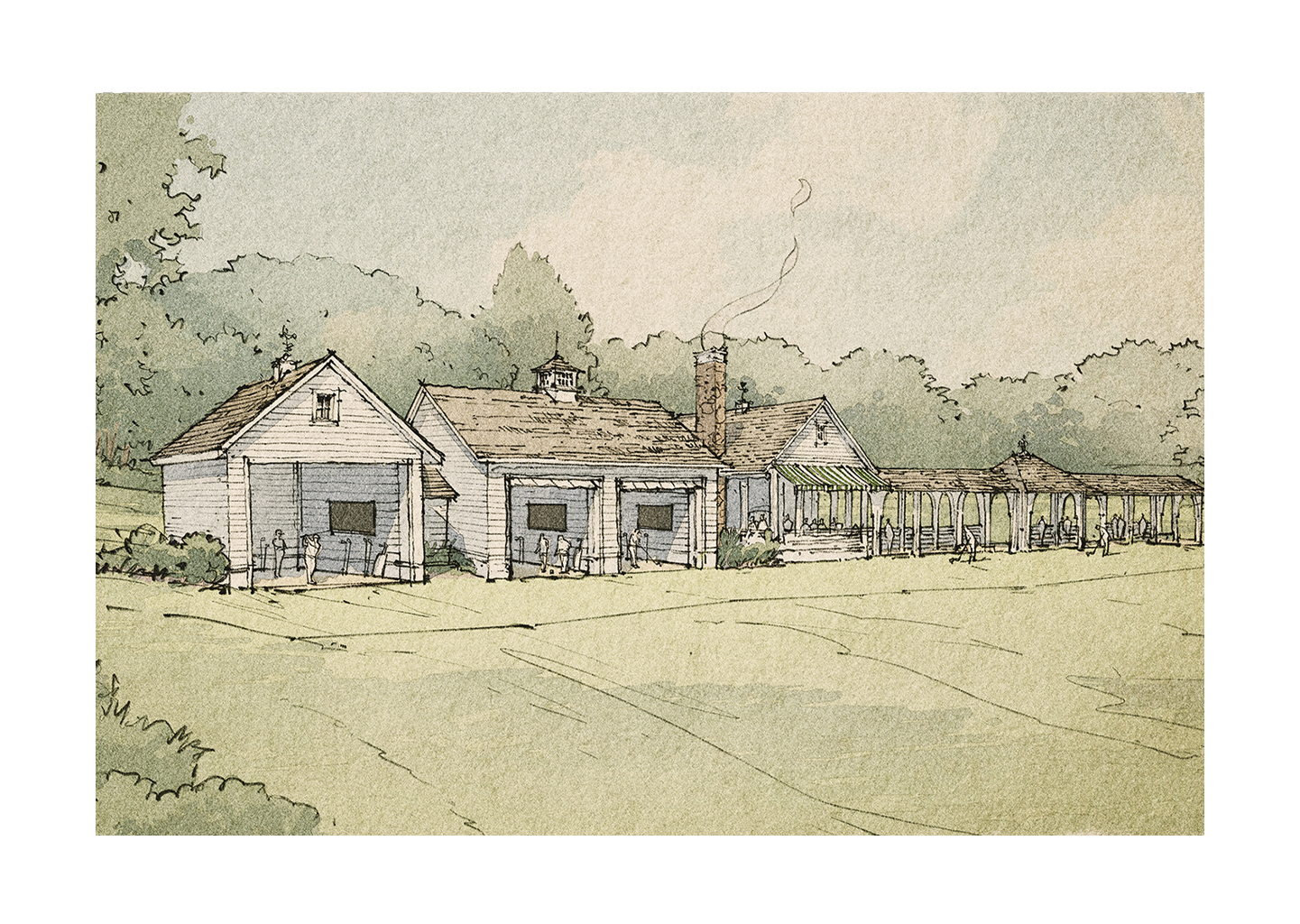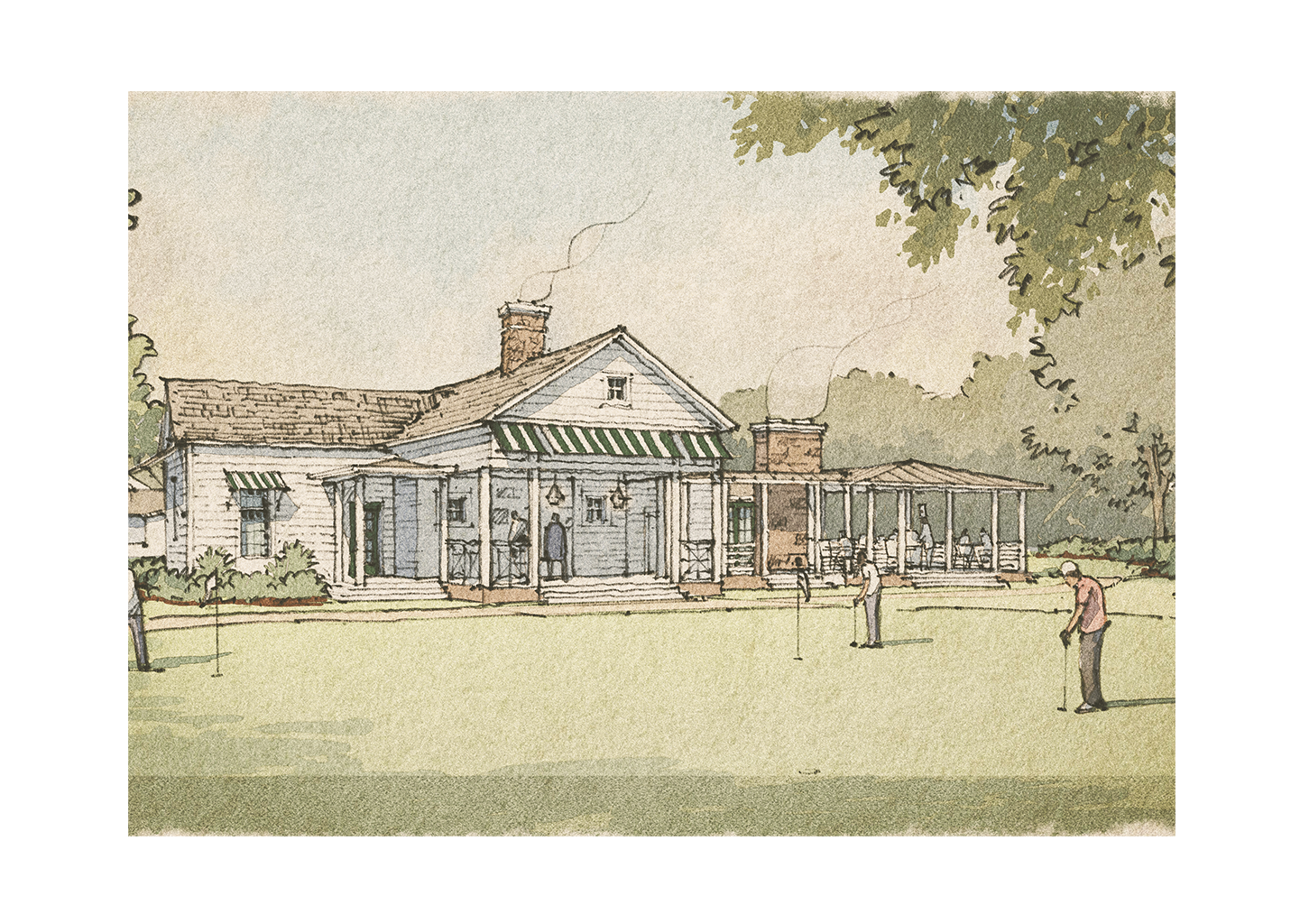 Arrival begins at a gracious bag drop and cart staging area, set within landscaped gardens and immediately adjacent to the new Pro Shop and Smokehouse, which also serves as the club’s turn. Here, members will find cold beverages and classic cocktails alongside an outdoor smoke pit with rotating daily specials—an easy, convivial gathering point overlooking the 18-hole Punch Bowl, designed for both practice and spirited competition.